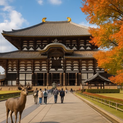 도다이지는 752년에 건립된 일본 최대의 불교 사찰로, 세계 최대 규모의 목조건축물 중 하나인 **대불전(大仏殿)**과 높이 15미터의 청동불상 **나라 대불(盧舎那仏)**로 유명합니다. 건물은 여러 차례 화재로 소실되었지만, 현재 모습은 1709년 재건된 것입니다. 도다이지는 단지 종교 시설을 넘어, 정치와 불교가 결합된 당시 국가체제의 상징이라 할 수 있습니다. - 가스가타이샤(春日大社)